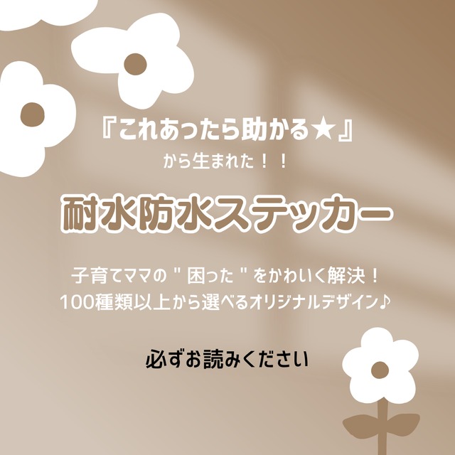 注意✭フルネーム、英文、ひらがな、漢字 のオーダーはinstagramのみの受付です! instagramからの orderで 人気No.1のMotif + Name Sticker ᵕ̈♩♡ ■⬜︎■⬜︎■ ⬜︎■⬜︎■ ⬜︎■⬜︎■ オーダー頂く前に以下を 必ずご確認お願い致します⋆꙳ ■⬜︎■ ⬜︎■⬜︎■ ⬜︎■⬜︎■ ⬜︎■ フォント、カラー、モチーフ、 たくさんの種類があります! 是非ぜひお好みの組み合わせを見つけてください✭ ※お好きなフォント、サイズ、カラーを チョイスして頂くスタイルになりますので 1つずつカートへお入れください♪ ● Font ● おひとつお選びください ひらがなご希望の場合は instagramからです ● Size & Price ● ❶一般的size ❁ 350yen ⇢縦5〜5cm以内 (コップやお弁当、水筒などに多いサイズ) デザインによっては耐久性を考慮し 1cmほどサイズアップしての作成となります。 (追加料金無し) 点や線が繊細な物に関しましては 5mm〜1cmほどサイズアップさせて頂く 可能性がございますm(_ _)m ❷Middle size ❁ +200 ⇢縦横幅7〜8cm以内で (ヘルメットやビニールバッグなどに多いサイズ) ❸Large size ❁ +300 ⇢縦横9〜10cm以内で (iimoの車輪はこちらのサイズです) ● 貼り付け方● 画像10枚目を参照* シリコンなどゴムのように表面が ヌルヌルしている物には貼り付きません 極端な凹凸(ザラザラ、チクチク)などの 素材には貼り付かない事もあります 本体貼り付けの前に、まずは 同封させて頂いているsampleで ご確認くださいm(_ _)m ● Color ● マットホワイト マットブラック マットゴールド マットシルバー マットブラウン マットグレー マットアイボリー マットベージュ からお選び頂けます❁ その他のカラーにつきましては、 instagramのDMよりお問い合わせください ● 注意事項 ● 防水加工が施されておりますので 屋外でのアイテム (タイル、ポスト、壁、ガラス、)等にも 適してはおりますが、 強く擦ったり長年の劣化などによっては 剥がれやすくなる事もございます ご理解のほどよろしくお願い致します Motif G.H.J.Kは指定サイズからなので、 Motifの選択画面で予め+料金での ご選択となります。 サイズ選択項目では通常サイズの ご選択をお願い致します。 Largeサイズご希望の場合は 各専用のサイズ選択をお願い致します。