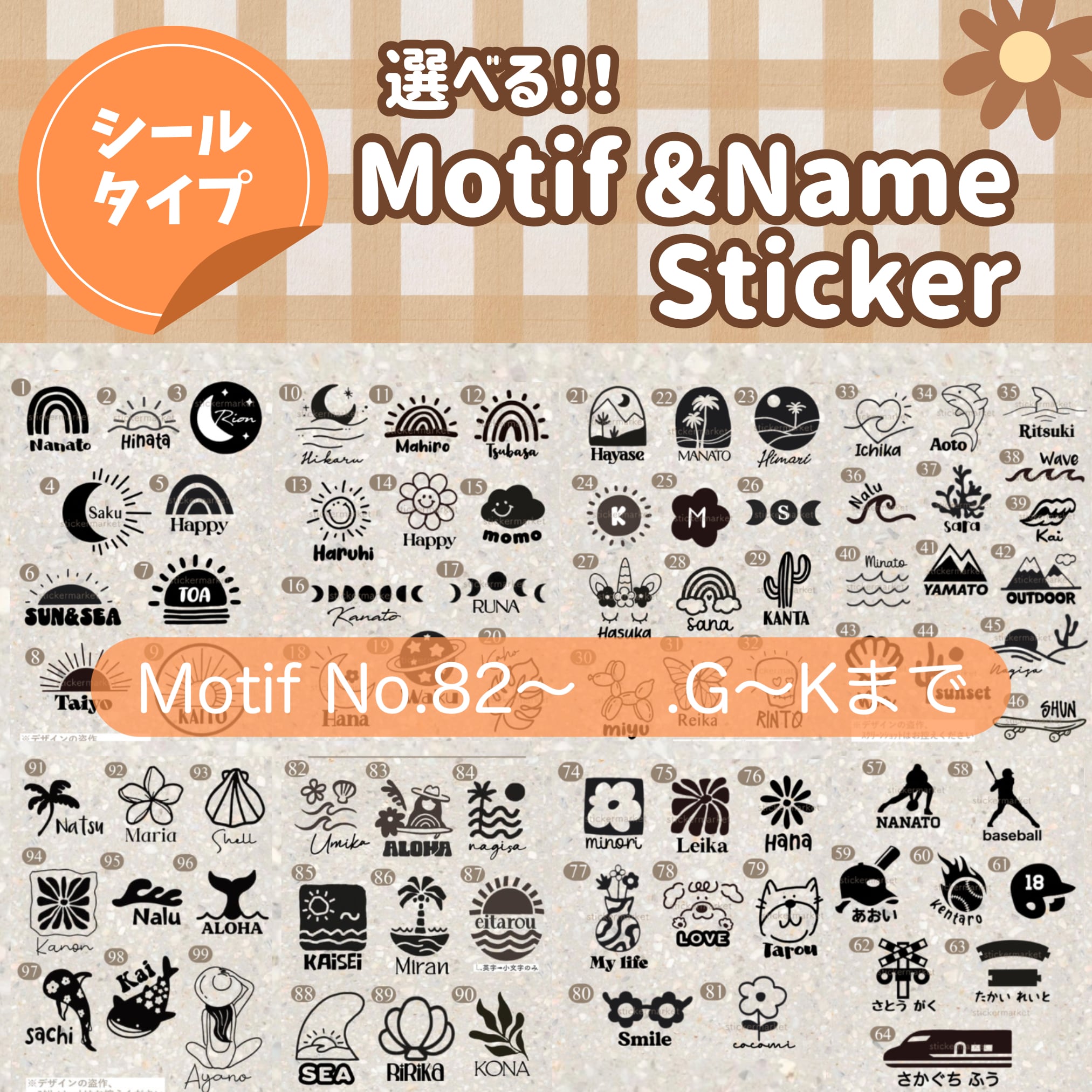 お名前入り防水ステッカー❁選べるMotif 82〜.G〜K |水筒・お弁当箱に♪